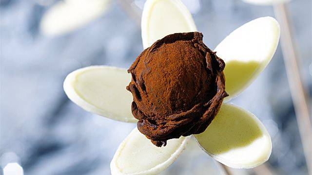 Tremper dans le chocolat de couverture noir Fleur de Cao™ 70%, puis dans de la poudre de cacao Extra Brute.